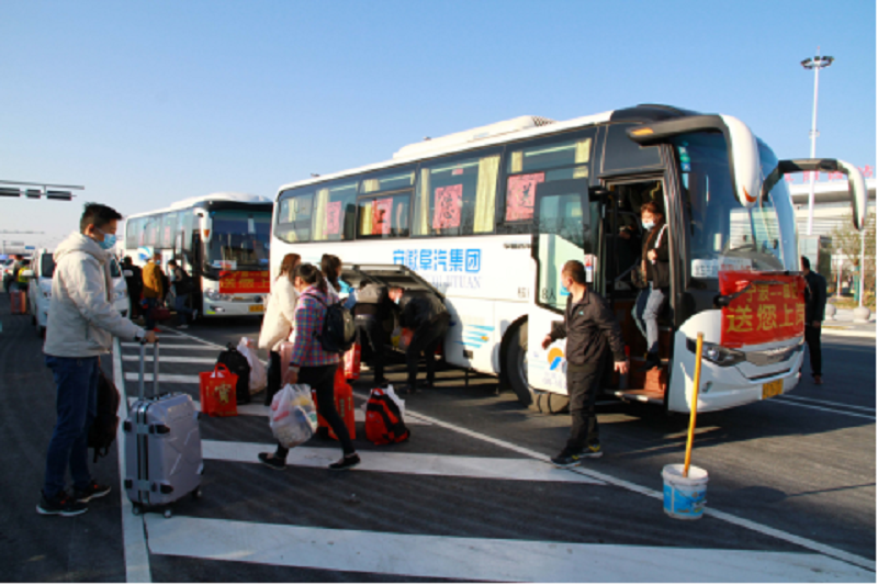 为圆满完成运输任务,集团制定了严密的疫情防控措施和应急预案。挑选技术状况良好车容整洁的车辆参与活动,确保安全设施、消防设备齐全有效。选派技术素质高、思想素质好的驾驶员担任驾驶任务。为方便务工人员上车,集团提前和人社部门对接,按照要求统一装饰车厢和悬挂条幅,营造温馨的活动氛围。根据乘车人员分布情况和具体数量,将大巴车开到冉庙镇、新乌江镇、杨楼孜镇、伍明周棚、闻集行流等集中点接务工人员,并协助运送行李。发车前,严格按照春运和疫情防控相关工作要求,将车内、外卫生打扫、冲洗干净,做好消杀工作。将健康码贴在车门醒目位置,要求乘客上车时扫码,乘车人员凭健康码绿码并测温正常后乘车,全程佩戴口罩,等待候车时保持 1 米社交距离。当天早晨8点左右,10辆张贴“送您上岗”活动条幅、窗花的大巴车陆续到达高铁西站,将199名乘车人员从各个乡镇安全转运至阜阳西站乘坐“阜阳至宁波”免费高铁。(王睿)