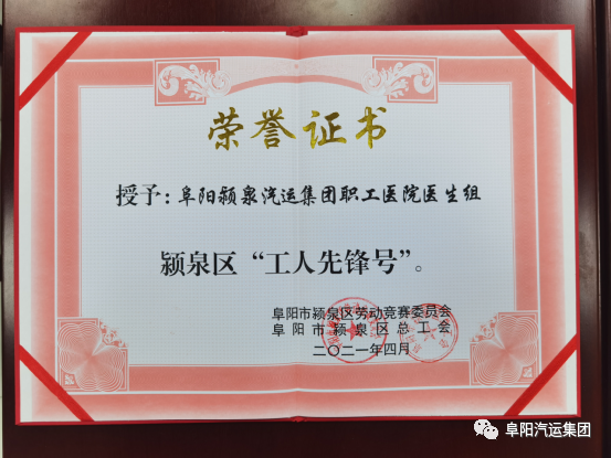 4月28日上午,颍泉区庆祝“五一”国际劳动节暨表彰大会隆重举行。会上,对获得2020年度颍泉区五一劳动奖状、五一劳动奖章和颍泉区工人先锋号的个人和集体进行了表彰。集团职工医院医生组榜上有名,荣获“颍泉区工人先锋号”称号。